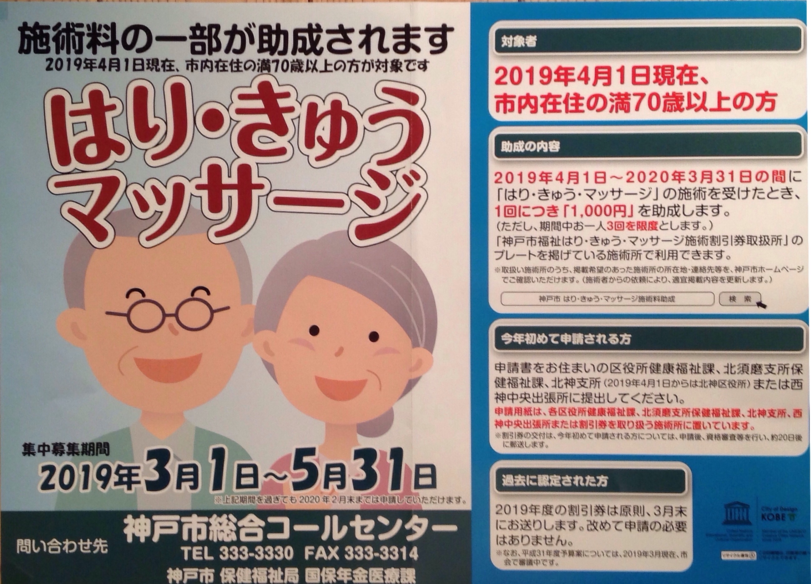 神戸市からはり・きゅう・マッサージの施術料の一部が助成されるのです。